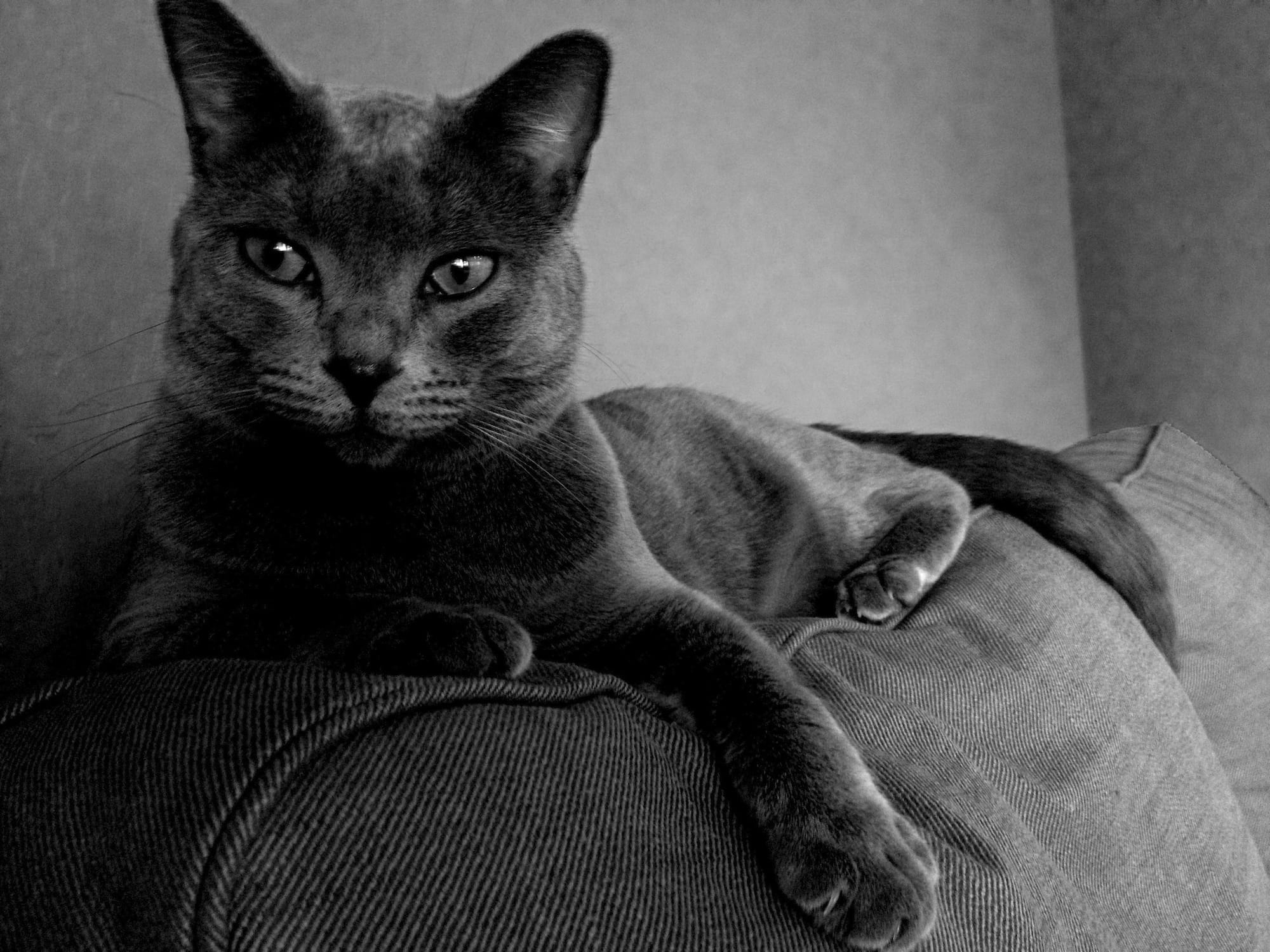 We think she’s mostly a Russian Blue, since she has the charcoal fur and rings on her tail common to that breed, but of course, any time an animal is found half-dead on the street, it’s impossible to really know. What we do know is that we hope to have her with us for a long time.